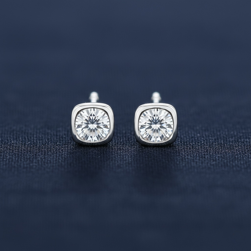 Defined by contemporary elegance, these earrings feature round brilliant diamonds encased in a sophisticated cushion-shaped bezel setting. Unlike traditional prongs, the smooth metal rim completely surrounds the stones, offering a seamless look that protects the edges while creating a striking, polished frame.
