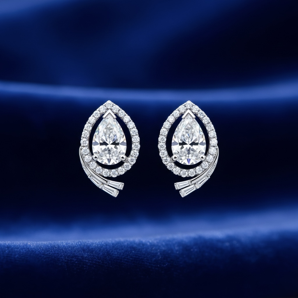 A modern masterpiece of light and form, these earrings feature a brilliant pear-cut center diamond framed by a shimmering pavé halo. The design is uniquely elevated by an asymmetrical architectural sweep of tapered baguette diamonds at the base, creating a sense of movement and sophisticated flair. Set in high-polish white gold, they offer a perfect balance of classic elegance and contemporary artistry.